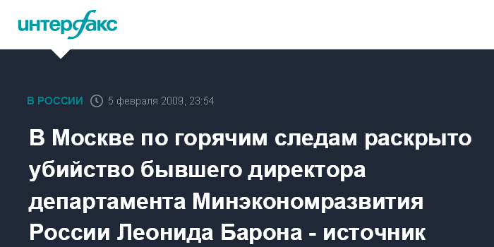 Москва. 5 февраля. ИНТЕРФАКС - По версии следствия бывший директор департамента Минэкономразвития России, гендиректор института социально- экономического инвестиционного проектирования Леонид Барон был убит в четверг в Москве с целью ограбления.