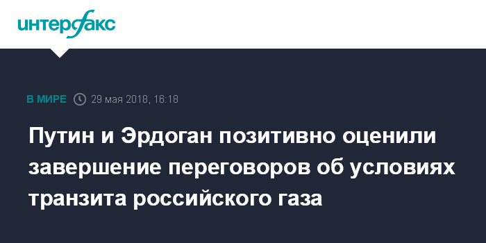 Москва. 29 мая. INTERFAX.RU - Президенты РФ и Турции Владимир Путин и Реджеп Тайип Эрдоган дали позитивную оценку успешному завершению переговоров об условиях транзита по турецкой территории российского газа b подтвердили настрой на укрепление партнерства, сообщает во вторник пресс-служба Кремля.