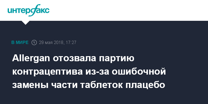 Москва. 29 мая. INTERFAX.RU - Ирландская фармацевтическая компания Allergan Plc отзывает один лот контрацептивного препарата Taytulla после обнаружения, что из-за ошибки в упаковки попали капсулы с плацебо вместо действующего вещества.