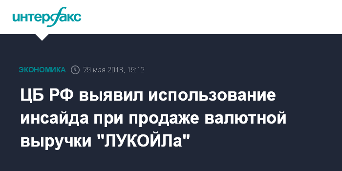 Москва. 29 мая. INTERFAX.RU - ЦБ РФ выявил неправомерное использование инсайдерской информации при осуществлении операций с валютными парами рубль/доллар (USDRUB_TOD и USDRUB_TOM) на торгах Московской биржи при продаже валютной выручки "ЛУКОЙЛа" в декабре 2015 года.