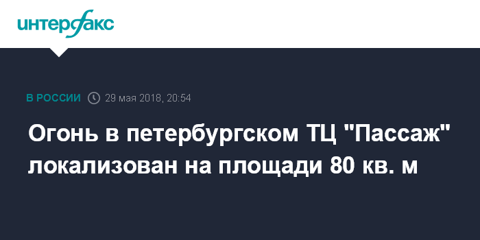Москва. 29 мая. INTERFAX.RU - Распространение огня в торговом центре "Пассаж" в центре Санкт-Петербурга остановлено, сообщили "Интерфаксу" в региональном главке МЧС.