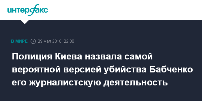 Москва. 29 мая. INTERFAX.RU - Первая очевидная причина убийства в Киеве журналиста, гражданина РФ Аркадия Бабченко - это его профессиональная деятельность, заявляет начальник Главного управления Нацполиции в Киеве Андрей Крищенко.