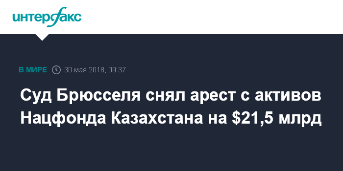Москва. 30 мая. INTERFAX.RU - Суд первой инстанции в Брюсселе снял предварительный арест с активов Национального фонда Казахстана на сумму около $21,5 млрд и постановил, что снять арест с оставшихся $530 млн можно в английских судах, сообщила пресс-служба Минюста республики.
