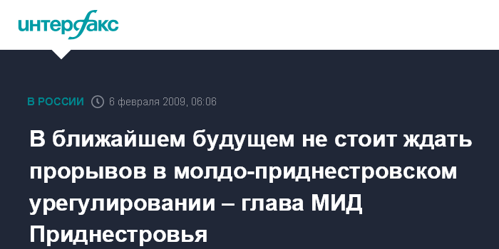 Тирасполь. 6 февраля. ИНТЕРФАКС - Смена власти в Молдавии не приведет к подвижкам в молдо-приднестровском урегулировании. Об этом заявил в четверг в программе "Вертикаль власти" государственного телеканала Приднестровья министр иностранных дел ПМР Владимир Ястребчак.