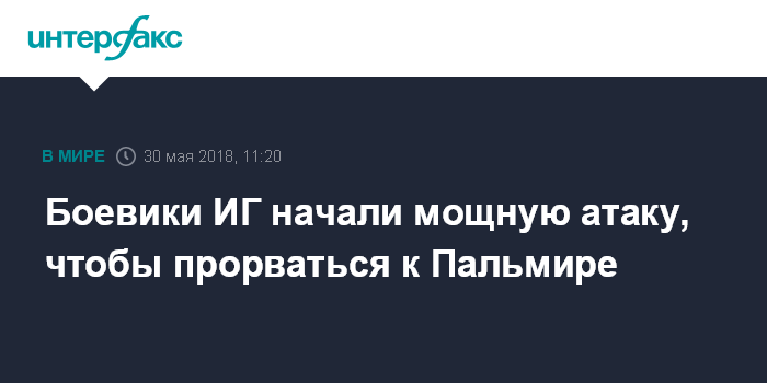 Москва. 30 мая. INTERFAX.RU - Террористическая группировка "Исламское государство" (ИГ, запрещена в РФ) в ночь на среду начала в восточном районе сирийской провинции Хомс масштабную атаку, сообщает арабский портал "Аль-Масдар" со ссылкой на военные источники.