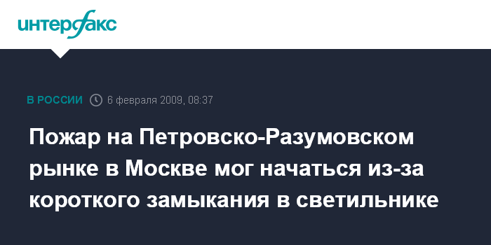 Москва. 6 февраля. INTERFAX.RU - Крупный пожар на Петровско-Разумовском рынке, произошедший накануне на севере Москвы, по предварительным данным, был вызван коротким замыканием, сообщил "Интерфаксу" источник в правоохранительных органах в пятницу.