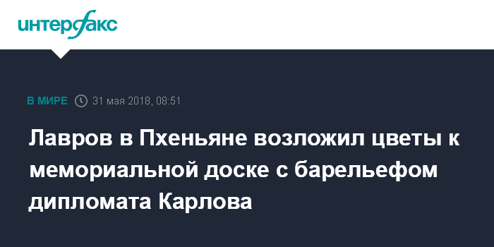 Москва. 31 мая. INTERFAX.RU - Министр иностранных дел России Сергей Лавров в ходе своего визита в КНДР в четверг возложил цветы к мемориальной доске с барельефом российского дипломата Андрея Карлова, убитого в Турции в 2016 году.
