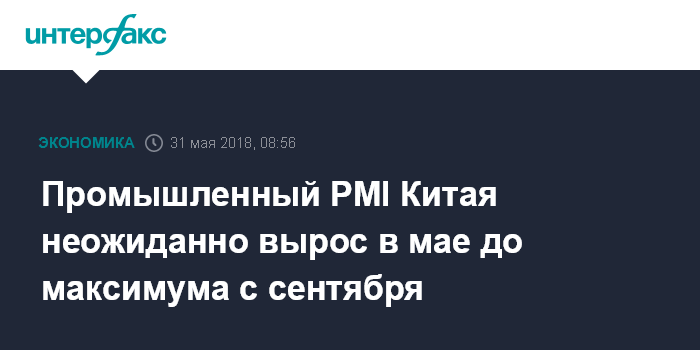 Москва. 31 мая. INTERFAX.RU - Индекс менеджеров закупок (PMI) в перерабатывающей промышленности Китая в мае 2018 года возобновил подъем вопреки ожиданиям рынка и достиг максимума с сентября.