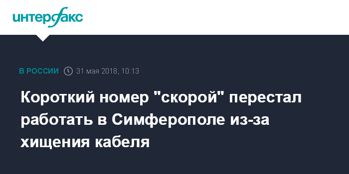 Москва. 31 мая. INTERFAX.RU - Хищение телефонного кабеля привело к невозможности с раннего утра четверга принимать вызовы "скорой помощи" по номеру "103" в столице Крыма, сообщает министерство здравоохранения республики.
