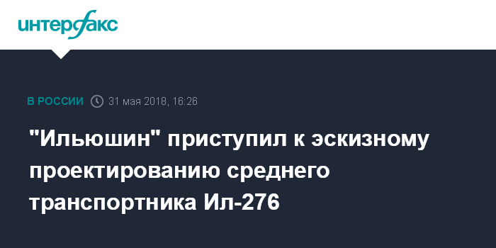 Москва. 31 мая. INTERFAX.RU - "Авиакомплекс имени Ильюшина" начал эскизное проектирование среднего военно-транспортного самолета (СВТС) Ил-276, сообщили "Интерфаксу" в компании.