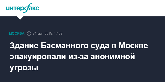 Москва. 31 мая. INTERFAX.RU - Порядка ста человек эвакуированы из здания Басманного суда в Москве после анонимного звонка об угрозе взрыва, сообщил "Интерфаксу" в четверг информированный источник.
