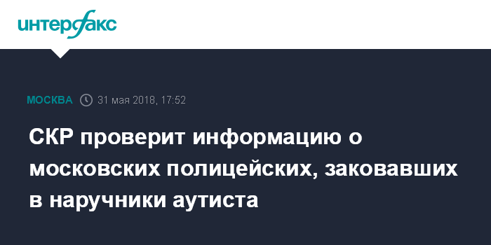 Москва. 31 мая. INTERFAX.RU - Следователи проверят информацию о применении в минувшее воскресенье полицейскими силы к молодому человеку, страдающему аутизмом, сообщила представитель столичного главка СК Юлия Иванова в четверг.