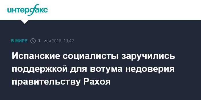 В четверг о поддержке социалистической партии в вопросе вотума недоверия Рахою заявили Баскская националистическая партия (PNV), у которой в Конгрессе депутатов 5 мест, Каталонская европейская демократическая партия (8 мест), партия "Компромисс" (4 места), партия "Бильду" (2 места) и "Новые Канары" (1 место). Ранее социалисты уже обеспечили себе поддержку альянса Unidos Podemos (67 мест) и Левых республиканцев Каталонии (ERC) - 9 мест.