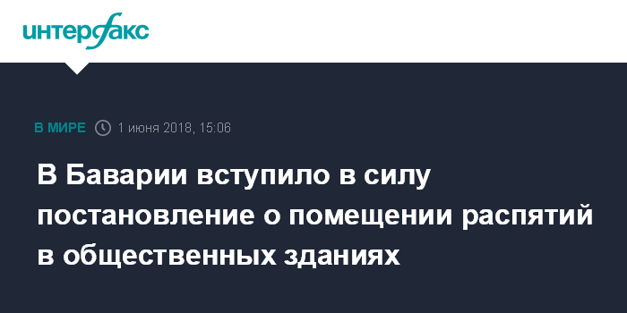 Москва. 1 июня. INTERFAX.RU - Постановление о помещении изображения христианского креста у входа в большинство общественных зданий вступило в пятницу в германской федеральной земле Бавария, сообщают немецкие СМИ.