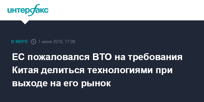В сообщении на сайте Еврокомиссии говорится, в частности, что европейские компании, которые приходят на китайский рынок, вынуждены передавать права пользования своими технологиями китайским юрлицам. Такой подход к регулированию этой сферы в КНР лишает компании ЕС возможности вести свободные переговоры о рыночных условиях соглашений о передаче технологий, отмечается в пресс-релизе.