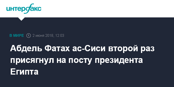 Москва. 2 июня. INTERFAX.RU - Президент Египта Абдель Фатах ас-Сиси в субботу принес присягу на посту главы государства, сообщает египетское издание Egyptian Today.