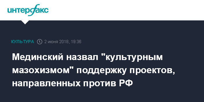 Москва. 2 июня. INTERFAX.RU - Министр культуры Владимир Мединский заявил, что ведомство не будет заниматься "культурным мазохизмом", поддерживая книжные проекты, направленные против России.