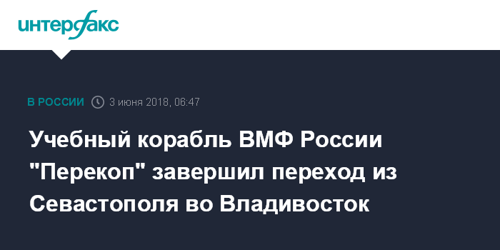 Москва. 3 июня. INTERFAX.RU - Учебный корабль "Перекоп" ВМФ России прибыл во Владивосток из Севастополя после дальнего двухмесячного похода, сообщил официальный представитель Тихоокеанского флота (ТОФ) Николай Воскресенский.