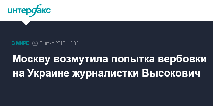 "2 июня стало известно, что Служба безопасности Украины пыталась завербовать корреспондента РИА Новости в Литве Ирину Высокович, прибывшую в украинский Херсон освещать судебный процесс по делу руководителя портала "РИА Новости-Украина" Кирилла Вышинского, арестованного по нелепому обвинению в государственной измене в рамках сфабрикованного уголовного дела", - говорится в комментарии ведомства.