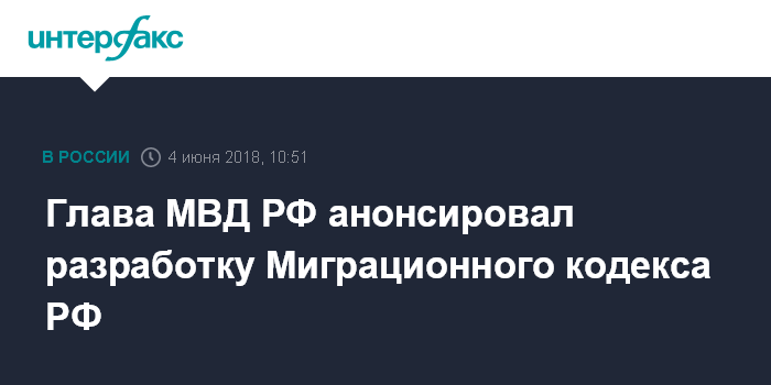Москва. 4 июня. INTERFAX.RU - МВД планирует составить так называемый Миграционный кодекс - свод законов, регламентирующий взаимодействие граждан и сотрудников правоохранительных органов в этой сфере, заявил глава МВД Владимир Колокольцев в интервью программе "Поздняков", опубликованном на сайте телеканала НТВ в понедельник.