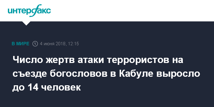 Москва. 4 июня. INTERFAX.RU - По меньшей мере 14 человек, в том числе семь религиозных деятелей и четыре сотрудника службы безопасности, погибли в результате террористического нападения на конференцию улемов (богословов) в Кабуле, сообщил в твиттере директор телеканала TOLO news Лотфулла Наджафизада.