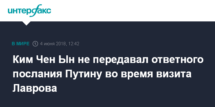 Москва. 4 июня. INTERFAX.RU - Лидер КНДР Ким Чен Ын не передавал ответного послания президенту РФ Владимиру Путину во время визита министра иностранных дел РФ Сергея Лаврова в Пхеньян, сообщил пресс-секретарь главы государства Дмитрий Песков.