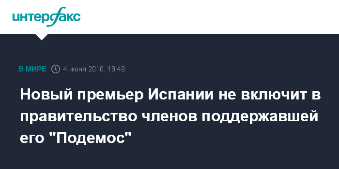 Москва. 4 июня. INTERFAX.RU - Социалист Педро Санчес, ставший главой правительства Испании после вынесения вотума недоверия бывшему премьеру Мариано Рахою, не намерен назначать на министерские посты членов поддержавшей его партии "Подемос".