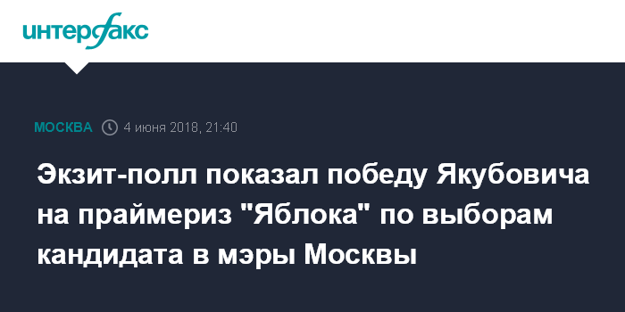 Москва. 4 июня. INTERFAX.RU - По данным экзит-полла, глава Тверского муниципального округа Яков Якубович побеждает на праймериз "Яблока" по выборам кандидата в мэры Москвы.