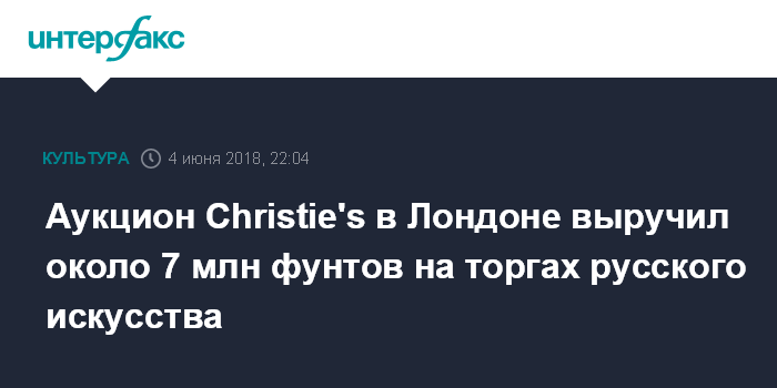 Москва. 4 июня. INTERFAX.RU - Суммарная выручка торгов русского искусства Christie's в Лондоне составила почти 7 млн фунтов.