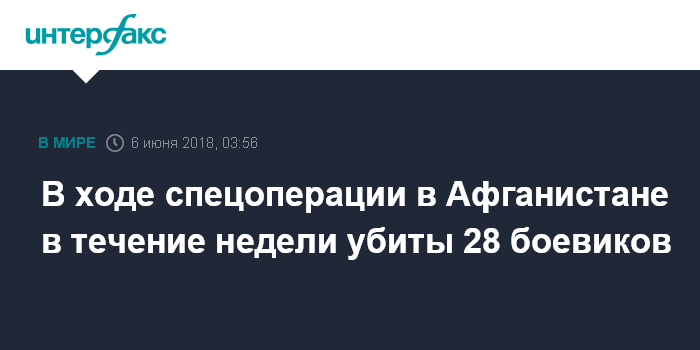 Москва. 6 июня. INTERFAX.RU - В ходе совместной операции "Ханджар-6", проводимой в течение недели силовиками Афганистана на территории приграничного с Таджикистаном уезда Кохистан провинции Бадахшан, на северо-востоке ИРА ликвидированы 28 боевиков, еще 38 участников незаконных вооруженных формирований ранены, сообщил в среду штаб 209 корпуса "Шохин" афганской национальной армии (АНА). Операция, в ходе которой от боевиков освобождены 17 селений, проводится силами второго полка 20 дивизии "Памир" АНА при поддержке авиации, говорится в сообщении.
