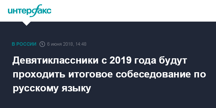 Москва. 6 июня. INTERFAX.RU - Итоговое собеседование по русскому языку станет обязательным для учеников 9-х классов школ со следующего учебного года, апробация испытания прошла этой весной и признана успешной, заявили в Рособрнадзоре.
