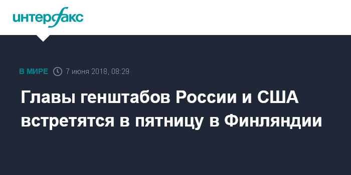 Москва. 7 июня. INTERFAX.RU - Начальник генерального штаба Вооруженных сил России Валерий Герасимов и председатель Объединенного комитета начальников штабов ВС США Джозеф Данфорд в пятницу встретятся в столице Финляндии, сообщают СМИ со ссылками на объявление финских Сил обороны.