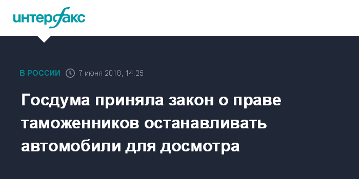 Москва. 7 июня. INTERFAX.RU - Госдума на заседании в четверг приняла в третьем, окончательном, чтении правительственный закон о наделении сотрудников Федеральной таможенной службы (ФТС) правом наряду с полицией и сотрудниками автоинспекции останавливать автомобили.