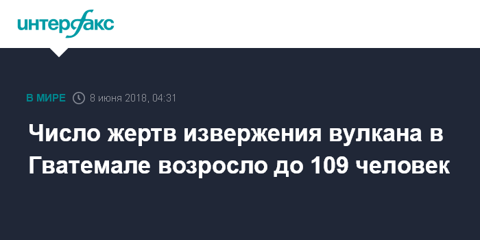 Москва. 8 июня. INTERFAX.RU - Власти Гватемалы подтвердили смерть 109 человек в результате извержения вулкана Фуэго, сообщает в четверг информагентство Associatеd Press; до этого было известно о 99 погибших.