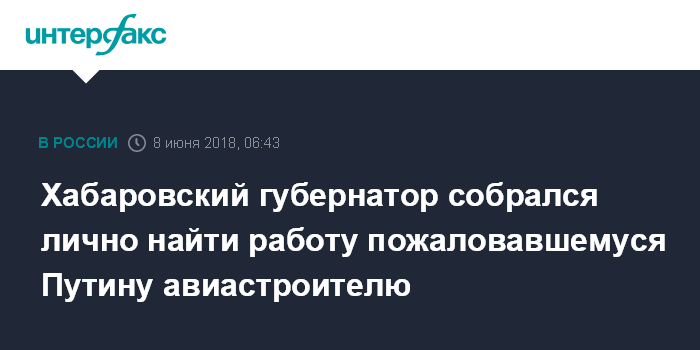 Москва. 8 июня. INTERFAX.RU - Глава Хабаровского края Вячеслав Шпорт собирается лично познакомиться с инженером-авиастроителем из Комсомольска-на-Амуре, который в ходе прямой линии рассказал Владимиру Путину о проблеме с трудоустройством.