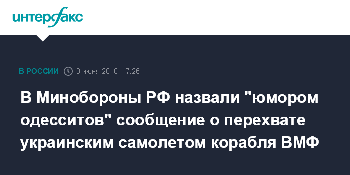"Гротескная новость одесской газеты об успешном перехвате украинским транспортным самолетом Ан-26 российского боевого корабля в Черном море говорит, прежде всего, о том, что неисчерпаемый юмор одесситов жив, несмотря ни на что", - сказал в пятницу официальный представитель Минобороны РФ Игорь Конашенков.