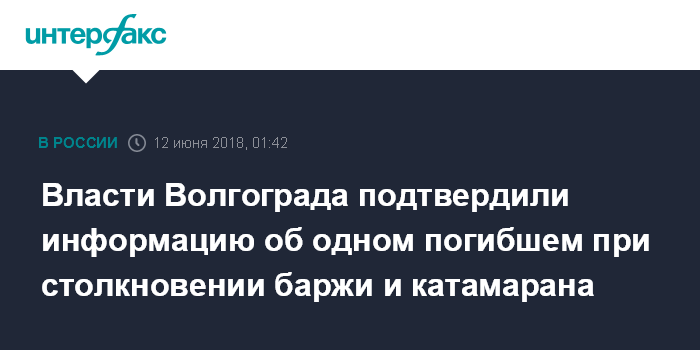 Москва. 12 июня. INTERFAX.RU - Информацию об одном погибшем, 5 спасенных и 10 без вести пропавших после столкновения катамарана и баржи подтвердили власти Волгоградской области.