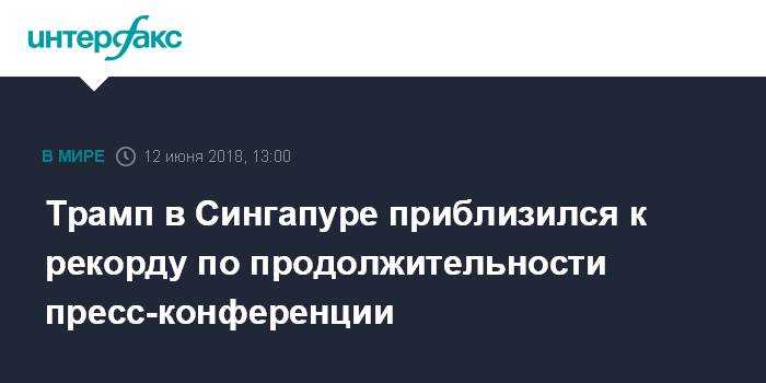 Москва. 12 июня. INTERFAX.RU - Пресс-конференция президента США Дональда Трампа по итогам переговоров с лидером КНДР Ким Чен Ыном в Сингапуре стала второй самой продолжительной за время его пребывания в Белом доме.