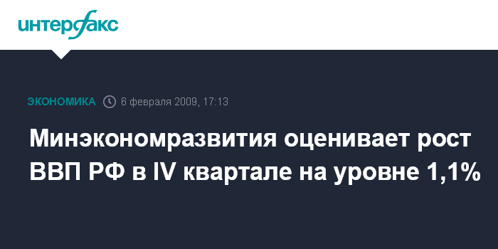 Москва. 6 февраля. INTERFAX.RU - Рост ВВП РФ, по оценке Минэкономразвития, в IV квартале 2008 года замедлился до 1,1%, говорится в мониторинге министерства.