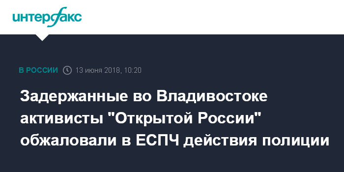 Москва. 13 июня. INTERFAX.RU - Активисты "Открытой России", которых во вторник на конференции во Владивостоке задержала полиция, направили жалобы в Европейский суд по правам человека, сообщили в пресс-службе движения.