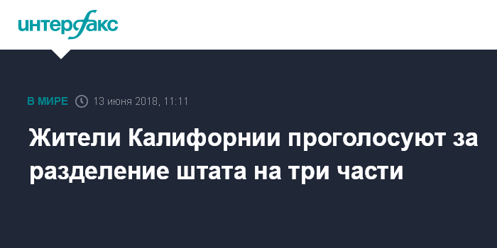 Москва. 13 июня. INTERFAX.RU - Инициатива о проведении референдума о разделении американского штата Калифорния на три штата смогла собрать более 400 тысяч подписей, голосование по данной инициативе пройдет 6 ноября 2018 года, сообщили в среду в местной администрации.