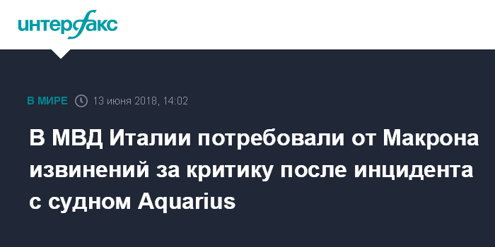 Москва. 13 июня. INTERFAX.RU - Министр внутренних дел Италии Маттео Сальвини в среду потребовал извинений от президента Франции Эммануэля Макрона за критику в адрес Рима в связи с ситуацией вокруг перевозившего нелегальных мигрантов судна Aquarius, передает в среду агентство Associated Press.
