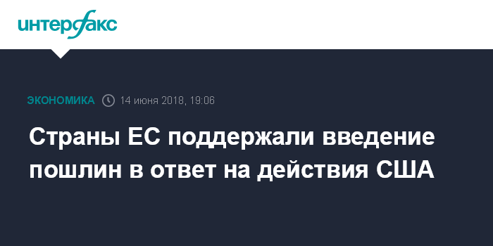 Москва. 14 июня. INTERFAX.RU - Страны Евросоюза поддержали план ответных мер на действия США, которые с 1 июня ввели пошлины на импорт стали и алюминия из ЕС в размере 25% и 10% соответственно.