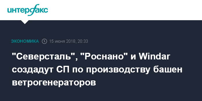 Москва. 15 июня. INTERFAX.RU - ПАО "Северсталь" и АО "Роснано" планируют создать совместное производство с испанской Windar Renovables, следует из материалов антимонопольного ведомства Германии, одной из стран, с регуляторами которых участники планируемой сделки ее согласовывают.