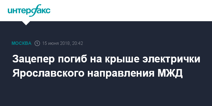 Москва. 15 июня. INTERFAX.RU - Зацепер погиб на крыше пригородного поезда на Ярославском направлении железной дороги, в связи с инцидентом некоторые электрички следуют с увеличенным интервалом, сообщили "Интерфаксу" в пресс-службе МЖД.