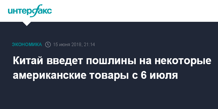 Москва. 15 июня. INTERFAX.RU - Китай вводит пошлины на импорт ряда американских товаров с 6 июля в ответ на решение США, сообщает в пятницу Bloomberg.
