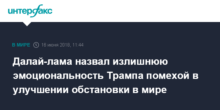 Москва. 16 июня. INTERFAX.RU - В международных отношениях, в том числе на уровне руководства США, слишком много эмоций, отметил в субботу на пресс-конференции в Риге духовный лидер Тибета, лауреат Нобелевской премии мира Далай-лама.