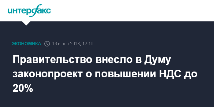 Повысить базовую ставку НДС с действующих 18% до 20% предложил Дмитрий Медведев на заседании правительства 14 июня. При этом он отметил, что все льготы по НДС на основные социально значимые товары и услуги будут сохранены. Предполагается, что новая ставка НДС будет действовать с 1 января 2019 года.