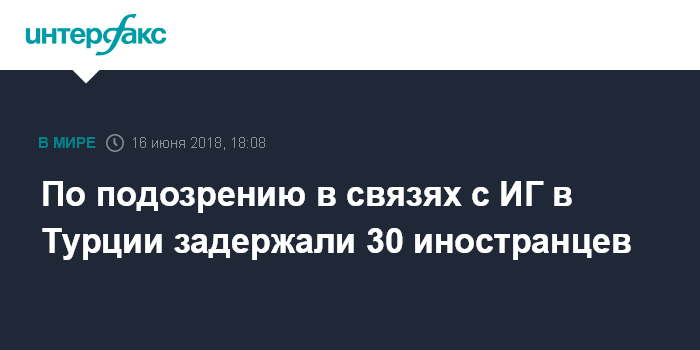 Москва. 16 июня. INTERFAX.RU - Службы безопасности Турции задержали в Стамбуле как минимум 30 иностранных граждан по подозрению в связях с террористической группировкой ИГ (запрещена в РФ), сообщает в субботу газета "Ени Шафак" со ссылкой на источники в полиции.