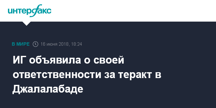 Москва. 16 июня. INTERFAX.RU - Ответственность за субботний теракт в административном центре восточной афганской провинции Нангархар взяла на себя террористическая группировка "Исламское государство" (запрещена в России), сообщили местные СМИ.